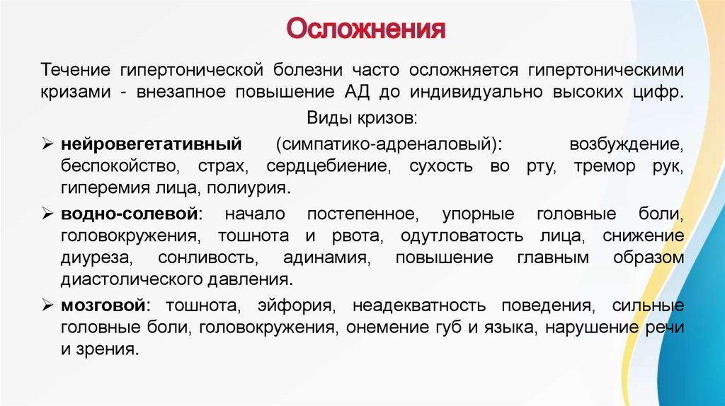 Течение гипертонической болезни часто осложняется гипертоническимикризами - внезапное повышение АД до индивидуально высоких цифр.