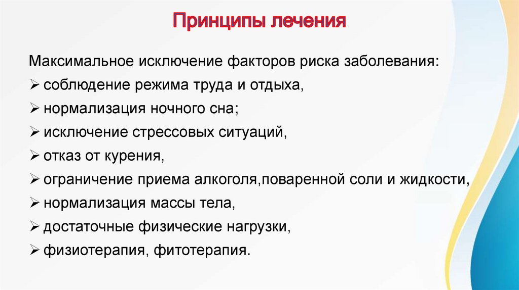 Максимальное исключение факторов риска заболевания:соблюдение режима труда и отдыха,