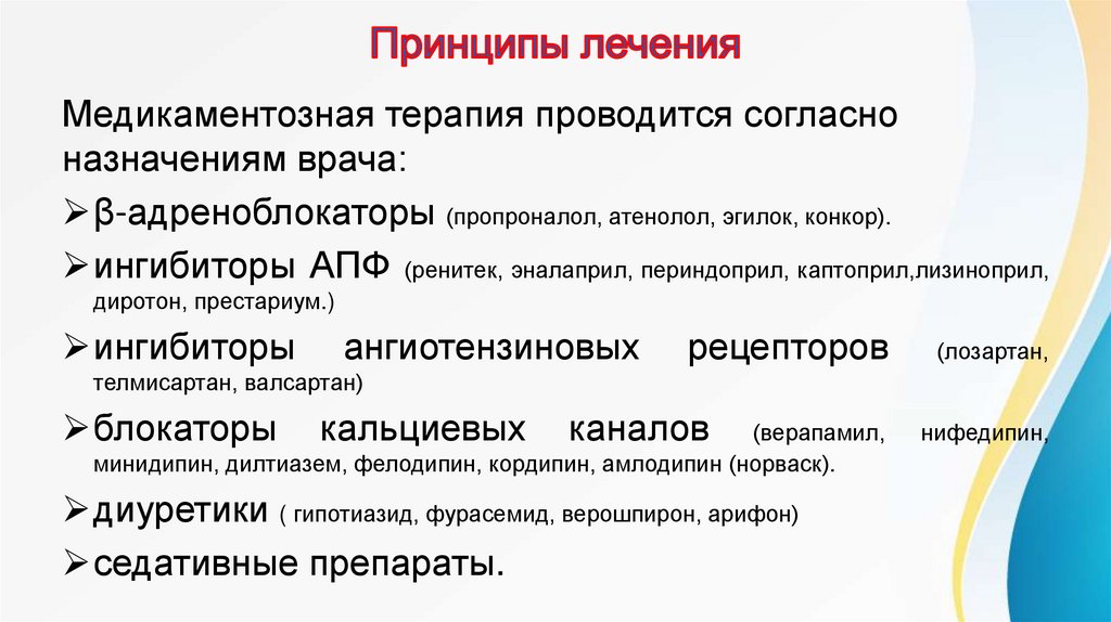 Медикаментозная терапия проводится согласноназначениям врача: