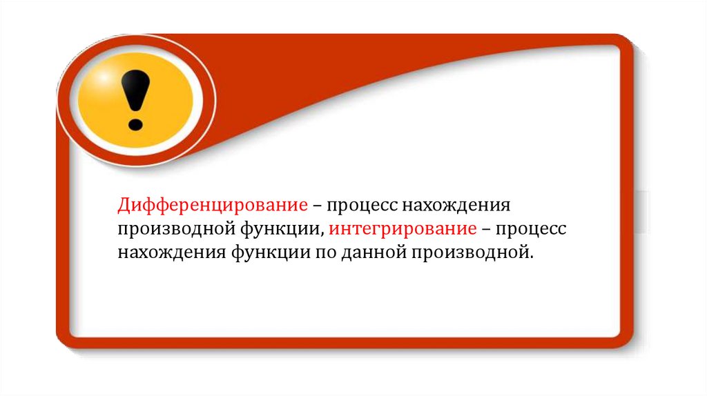 Дифференцирование – процесс нахожденияпроизводной функции, интегрирование – процесс