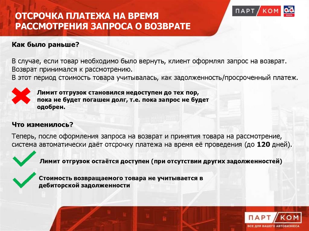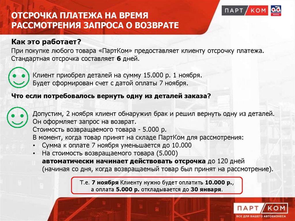 При покупке любого товара «ПартКом» предоставляет клиенту отсрочку платежа.