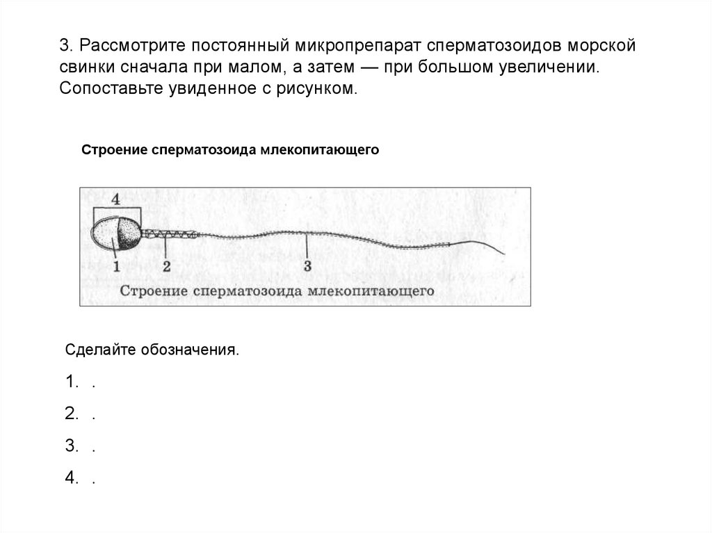 3. Рассмотрите постоянный микропрепарат сперматозоидов морскойсвинки сначала при малом, а затем — при большом увеличении.