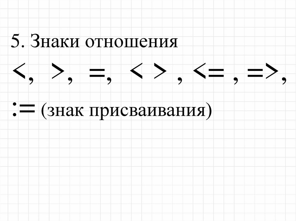 5. Знаки отношения<, >, =, < > , <= , =>,