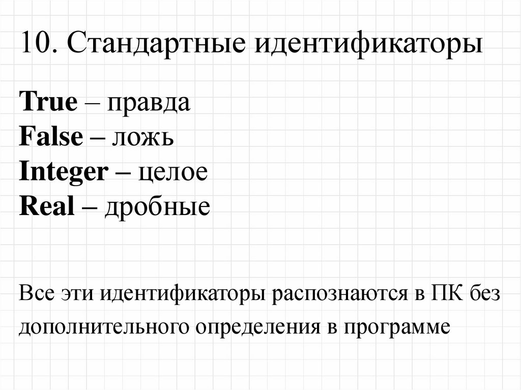 10. Стандартные идентификаторыTrue – правда