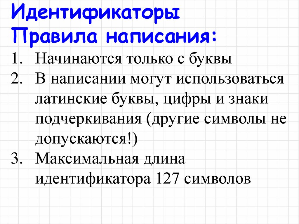 ИдентификаторыПравила написания: