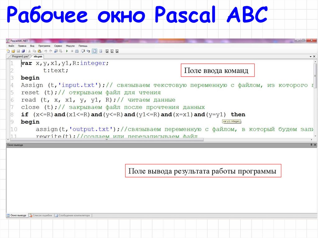 Рабочее окно Pascal ABCПоле ввода команд