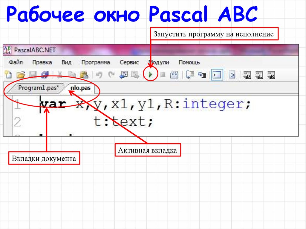 Рабочее окно Pascal ABCЗапустить программу на исполнение
