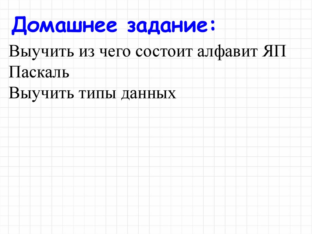 Домашнее задание:Выучить из чего состоит алфавит ЯП