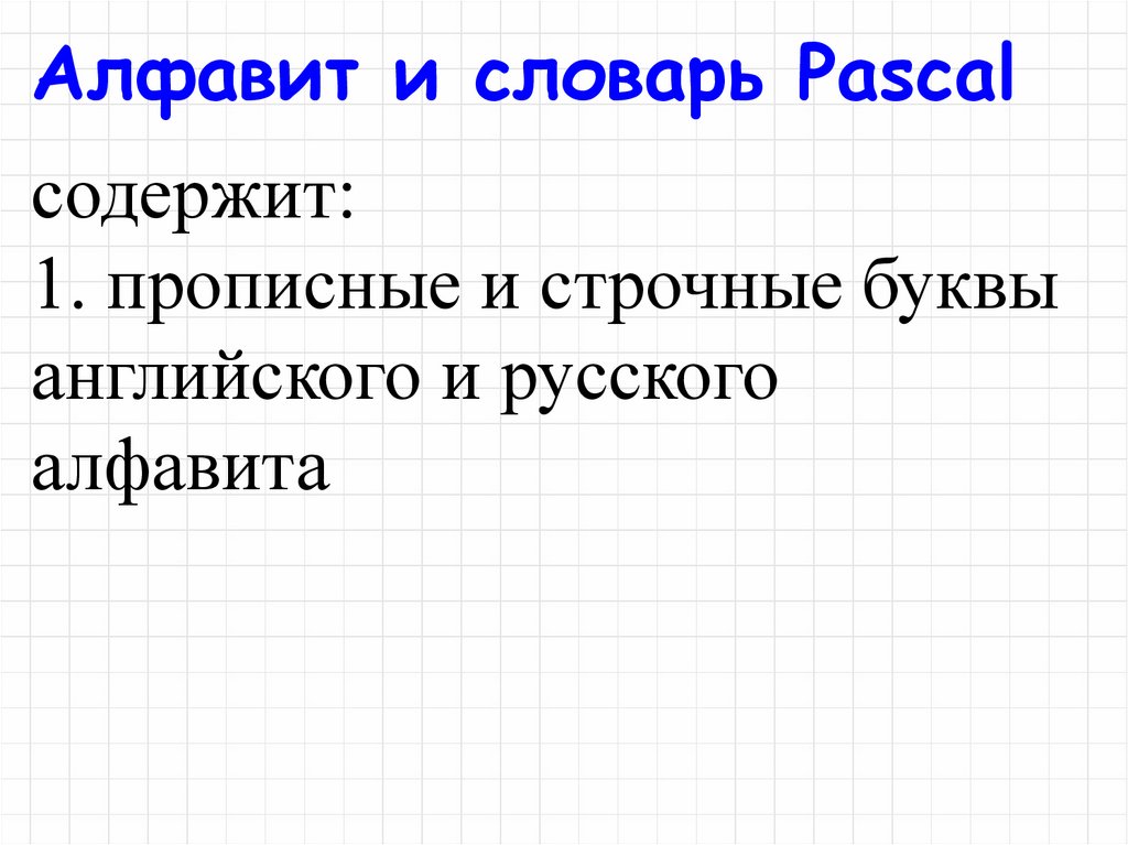Алфавит и словарь Pascalсодержит: