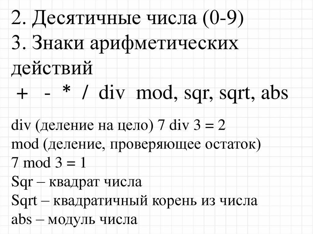 2. Десятичные числа (0-9)3. Знаки арифметических