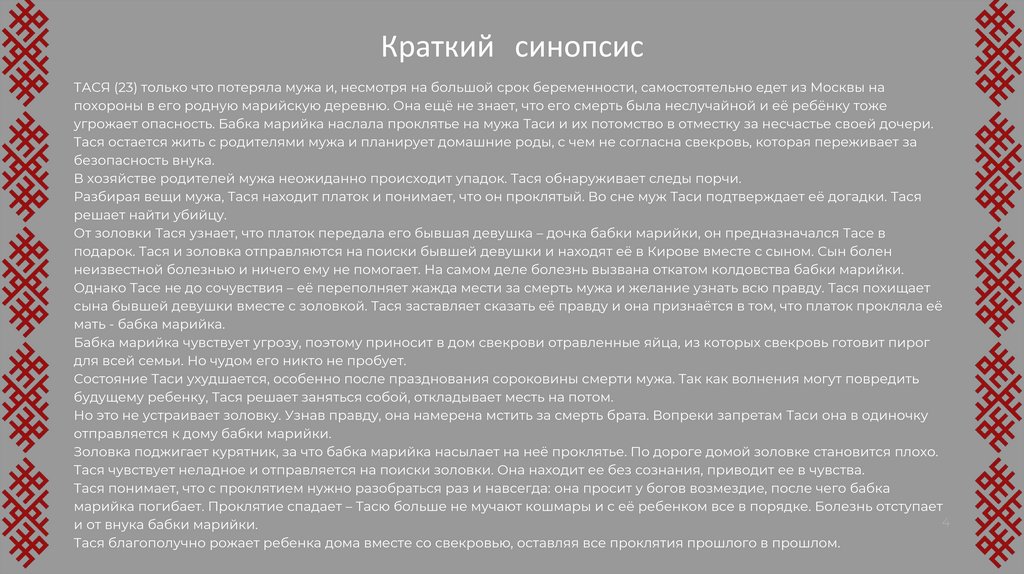 похороны в его родную марийскую деревню. Она ещё не знает, что его смерть была неслучайной и её ребёнку тоже