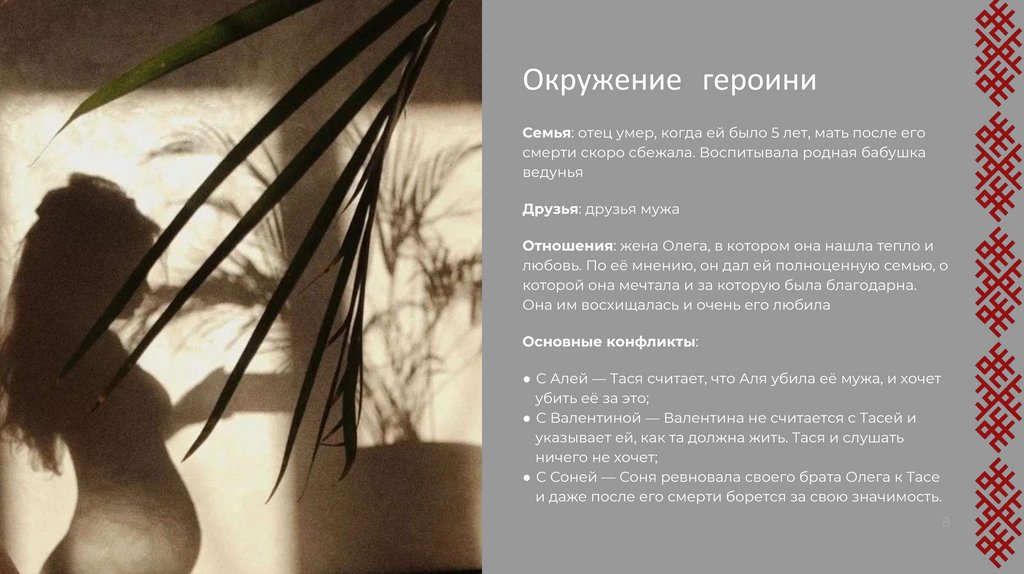 Окружение героиниСемья: отец умер, когда ей было 5 лет, мать после его