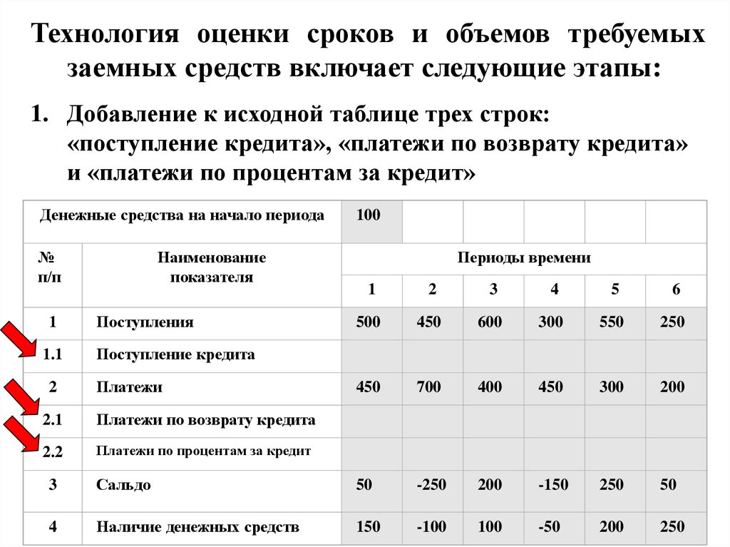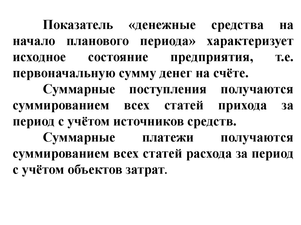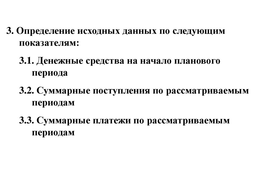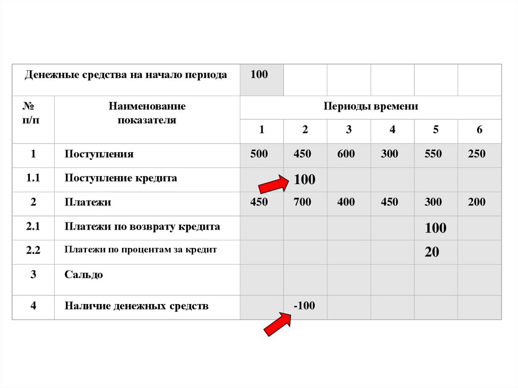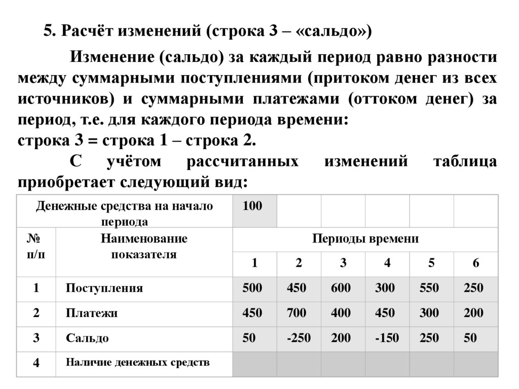 средства на начало периода, поступления и платежи, для каждого периода времени;