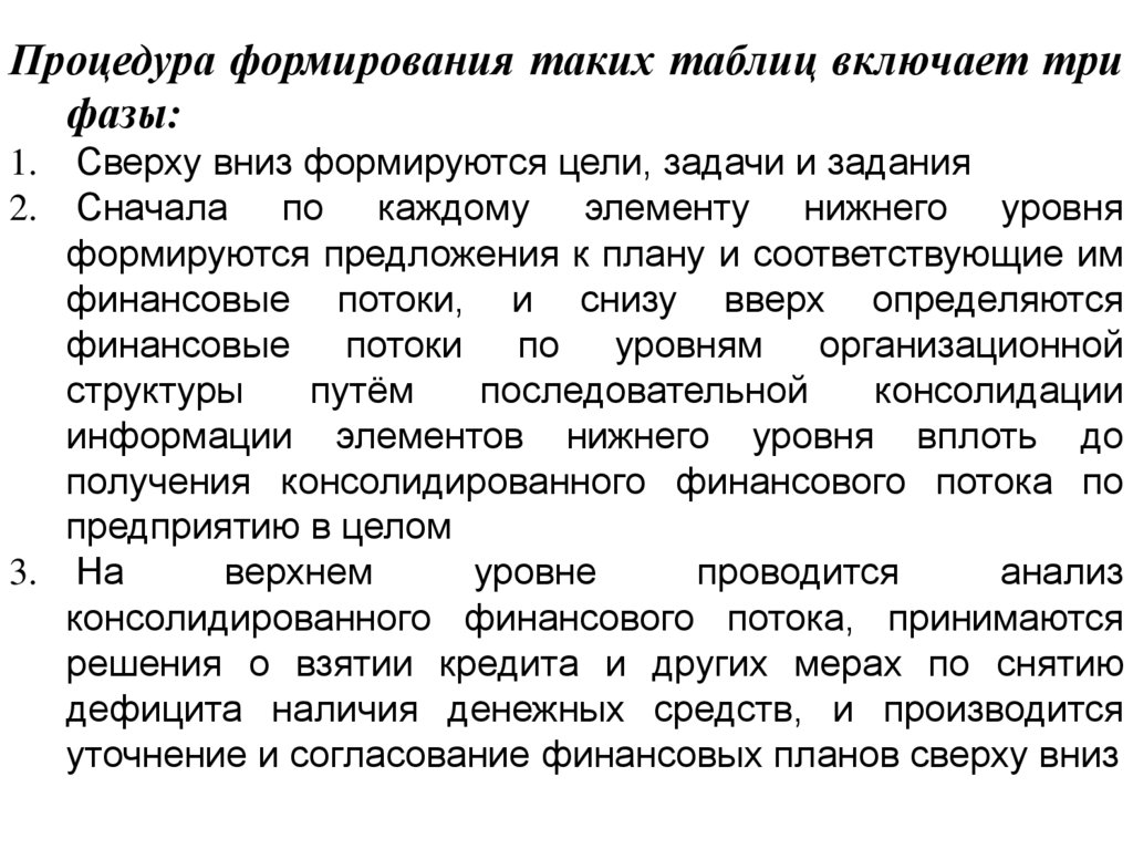 согласование финансовых потоков сверху вниз,