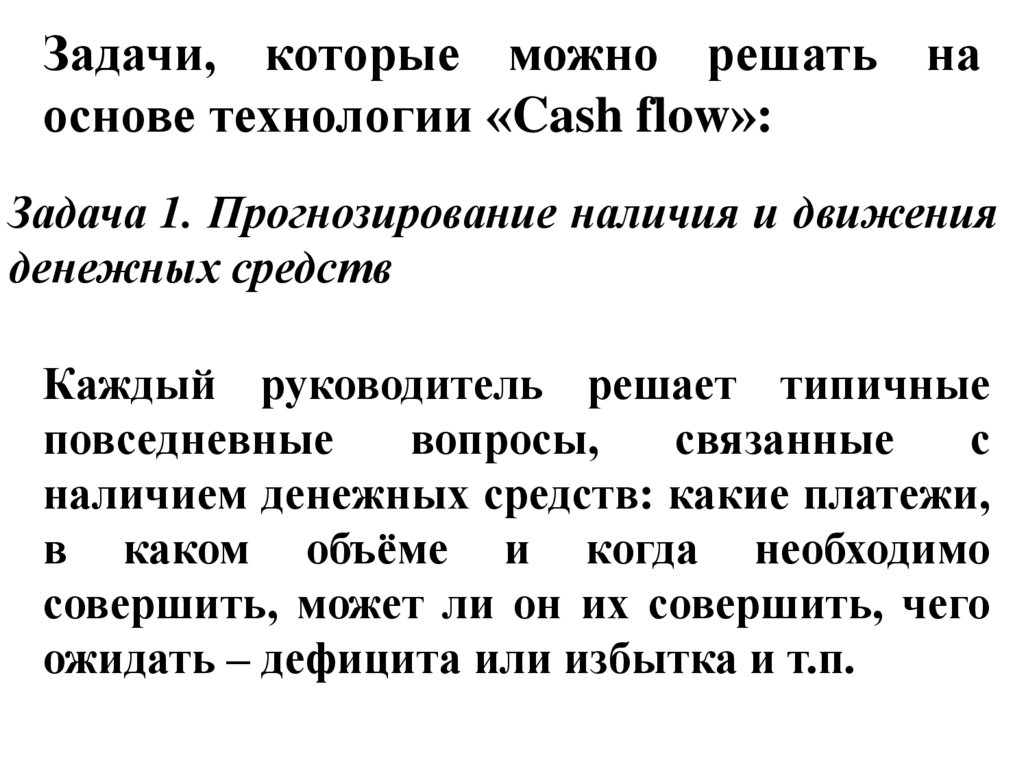 Задачи, которые можно решать наоснове технологии «Cash flow»: