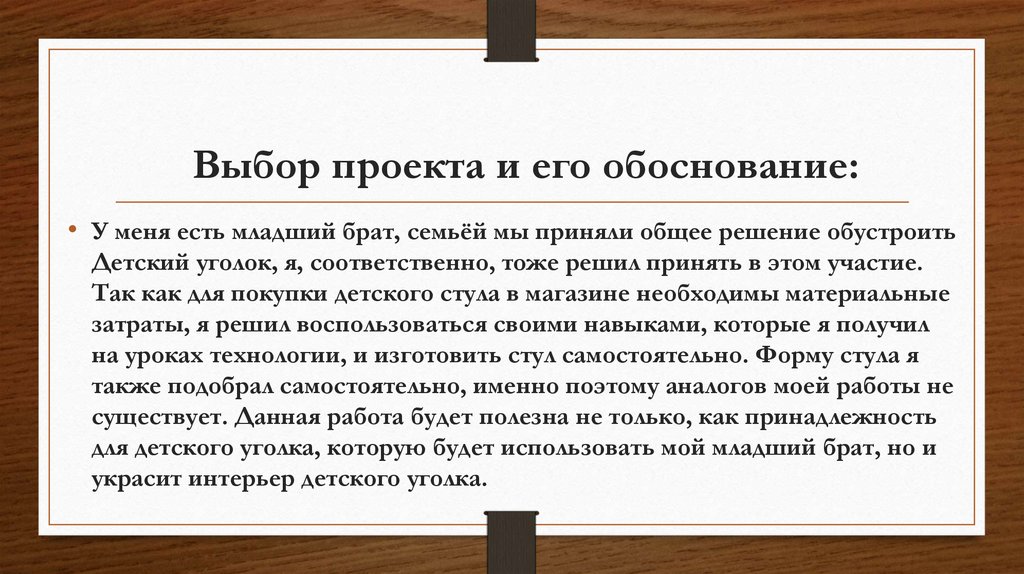 Выбор проекта и его обоснование:• У меня есть младший брат, семьёй мы приняли общее решение обустроить