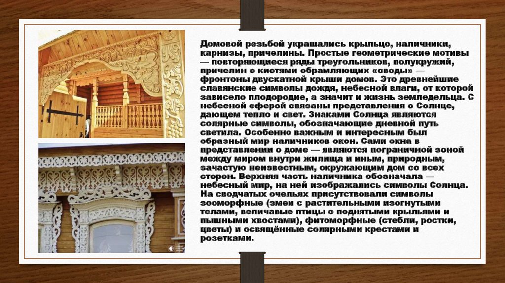 Домовой резьбой украшались крыльцо, наличники,карнизы, причелины. Простые геометрические мотивы