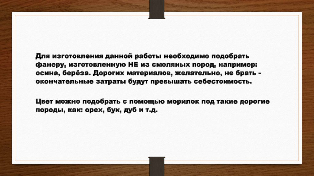 Для изготовления данной работы необходимо подобратьфанеру, изготовленную НЕ из смоляных пород, например: