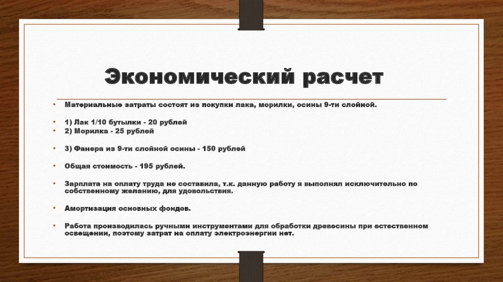 Экономический расчетМатериальные затраты состоят из покупки лака, морилки, осины 9-ти слойной.