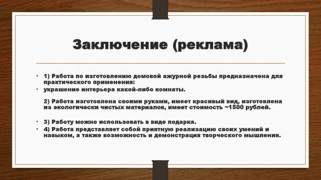 Заключение (реклама)• 1) Работа по изготовлению домовой ажурной резьбы предназначена для