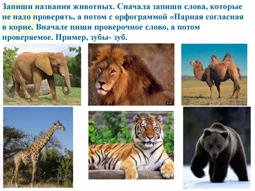 Запиши названия животных. Сначала запиши слова, которыене надо проверять, а потом с орфограммой «Парная согласная
