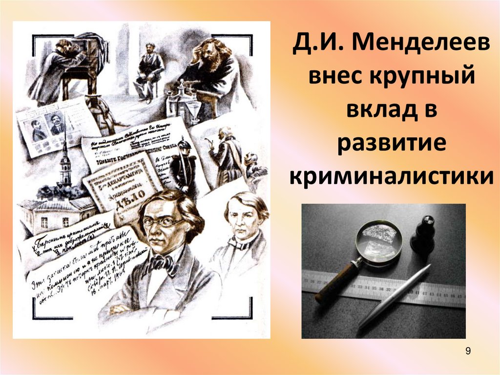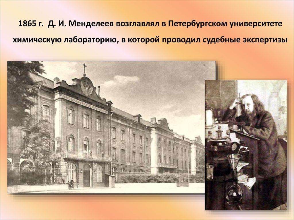 1865 г. Д. И. Менделеев возглавлял в Петербургском университетехимическую лабораторию, в которой проводил судебные экспертизы