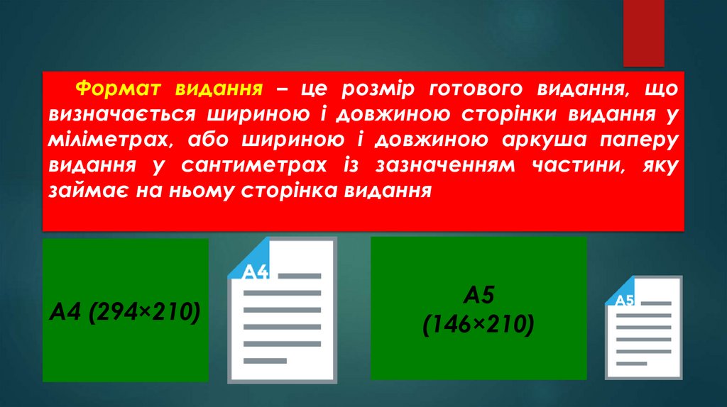 Формат видання – це розмір готового видання, щовизначається шириною і довжиною сторінки видання у