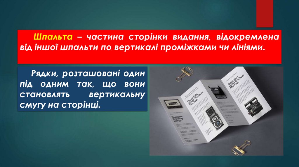 Шпальта – частина сторінки видання, відокремленавід іншої шпальти по вертикалі проміжками чи лініями.