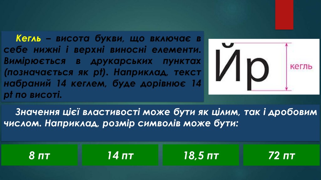 Кегль – висота букви, що включає всебе нижні і верхні виносні елементи.