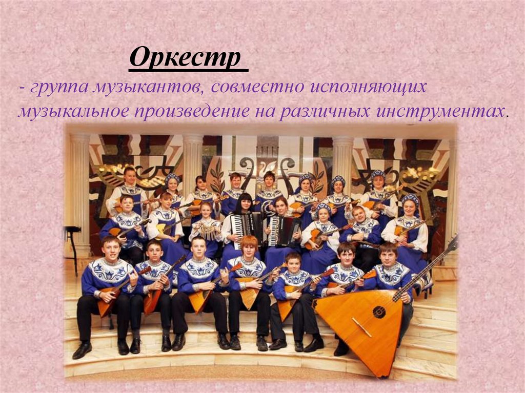 Оркестр- группа музыкантов, совместно исполняющих