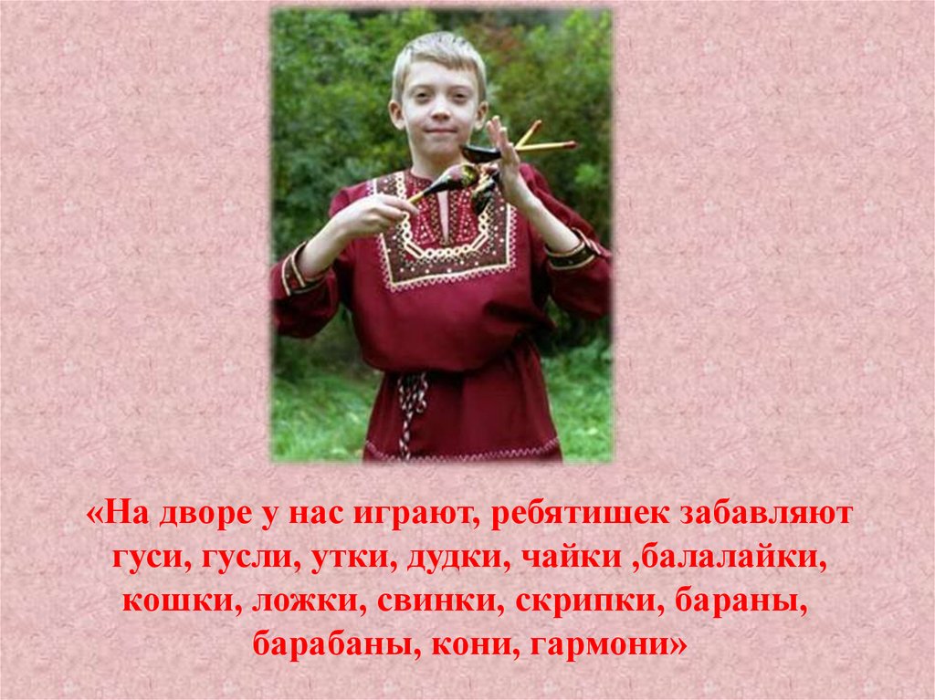 «На дворе у нас играют, ребятишек забавляютгуси, гусли, утки, дудки, чайки ,балалайки,