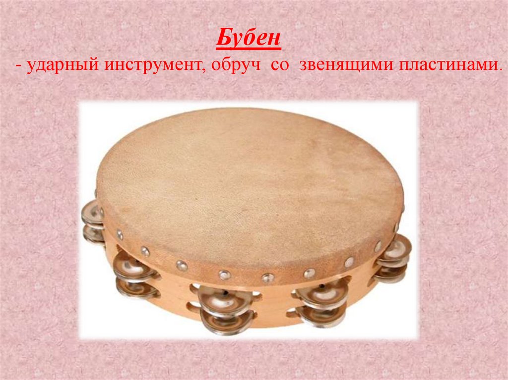 Бубен- ударный инструмент, обруч со звенящими пластинами.