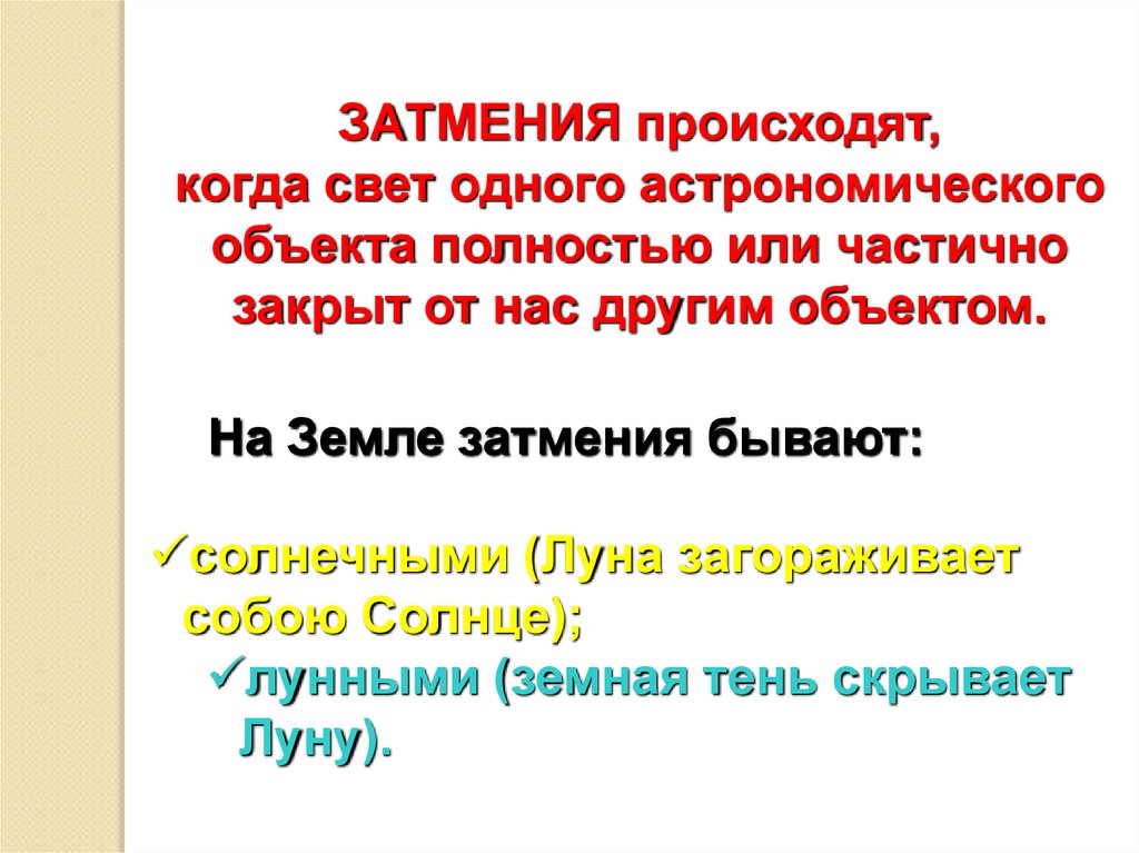 ЗАТМЕНИЯ происходят,когда свет одного астрономического