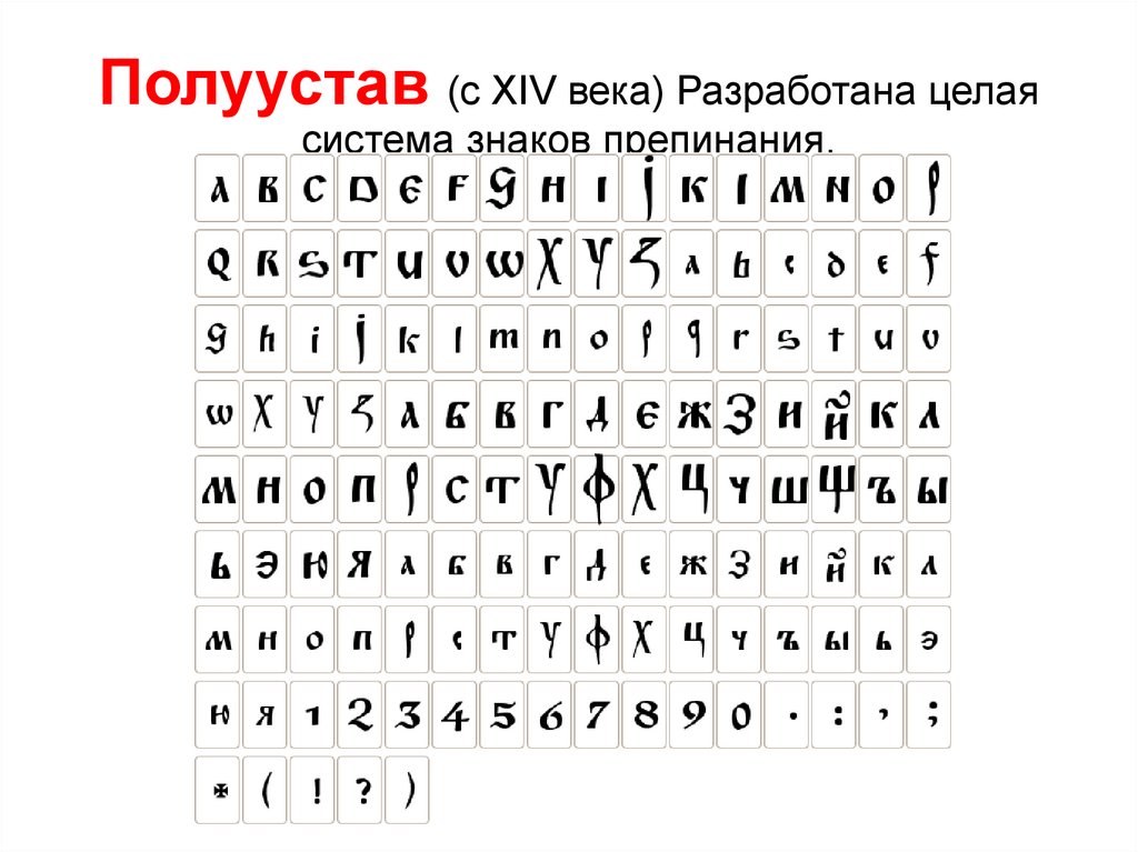 Полуустав (с XIV века) Разработана целаясистема знаков препинания.