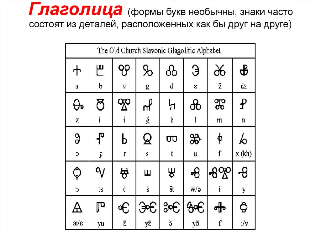 Глаголица (формы букв необычны, знаки частосостоят из деталей, расположенных как бы друг на друге)