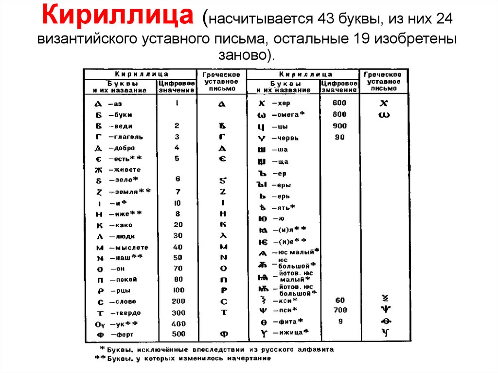 Кириллица (насчитывается 43 буквы, из них 24византийского уставного письма, остальные 19 изобретены
