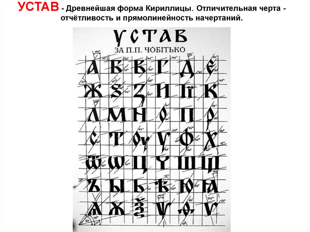 УСТАВ - Древнейшая форма Кириллицы. Отличительная черта отчётливость и прямолинейность начертаний.11.