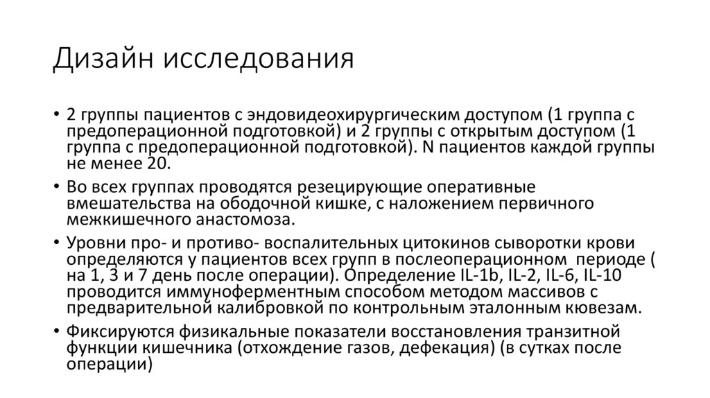 Дизайн исследования• 2 группы пациентов с эндовидеохирургическим доступом (1 группа с