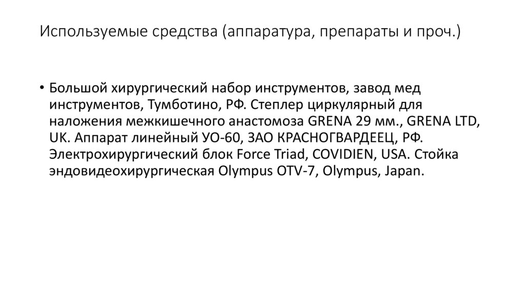Используемые средства (аппаратура, препараты и проч.)• Большой хирургический набор инструментов, завод мед
