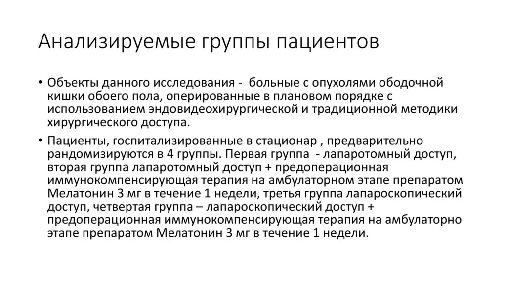 Анализируемые группы пациентов• Объекты данного исследования - больные с опухолями ободочной