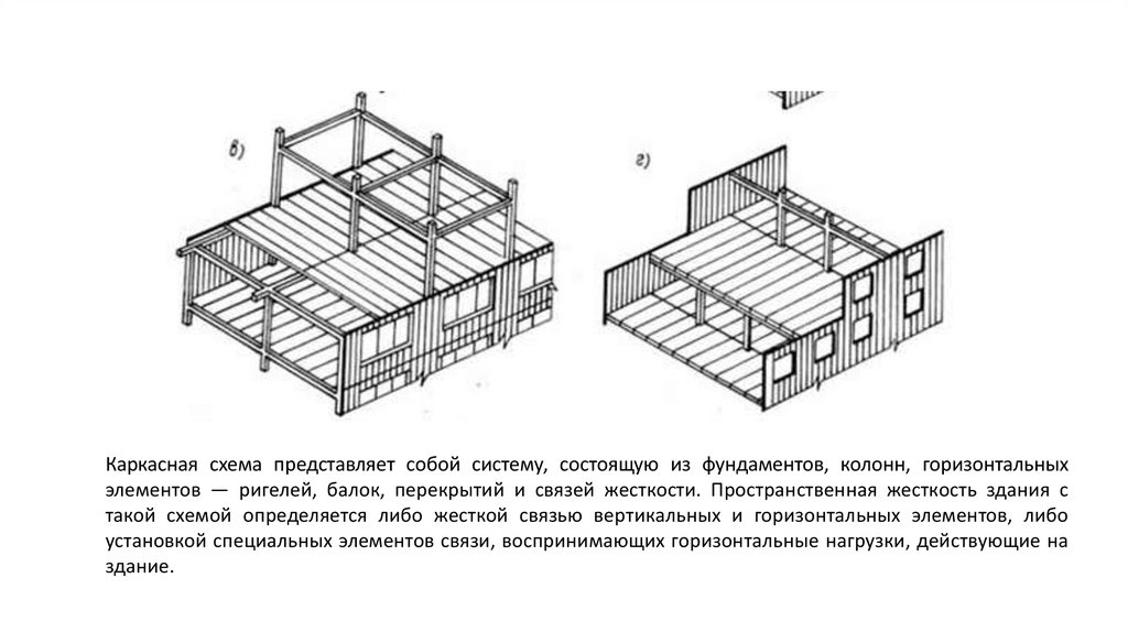 Каркасная схема представляет собой систему, состоящую из фундаментов, колонн, горизонтальныхэлементов — ригелей, балок, перекрытий и связей жесткости. Пространственная жесткость здания с