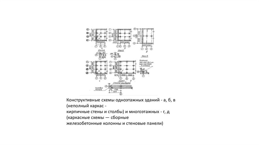 Конструктивные схемы одноэтажных зданий - а, б, в(неполный каркас кирпичные стены и столбы) и многоэтажных - г, д