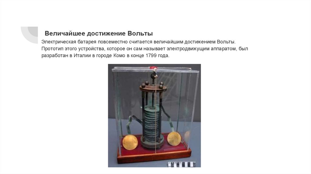Величайшее достижение ВольтыЭлектрическая батарея повсеместно считается величайшим достижением Вольты.