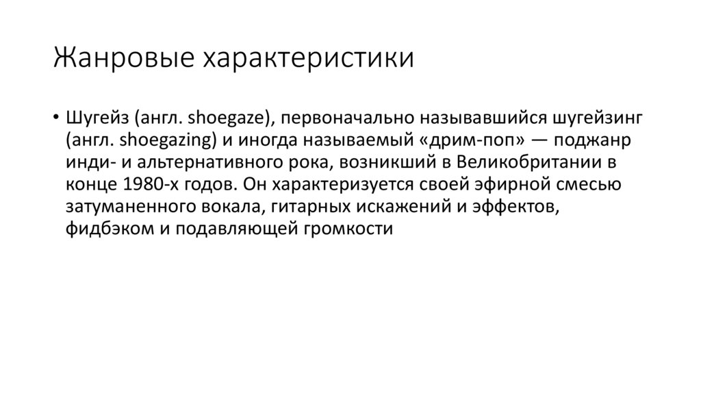 Жанровые характеристики• Шугейз (англ. shoegaze), первоначально называвшийся шугейзинг