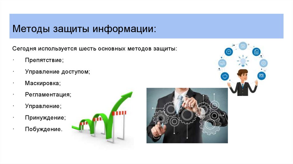 Методы защиты информации:Сегодня используется шесть основных методов защиты: