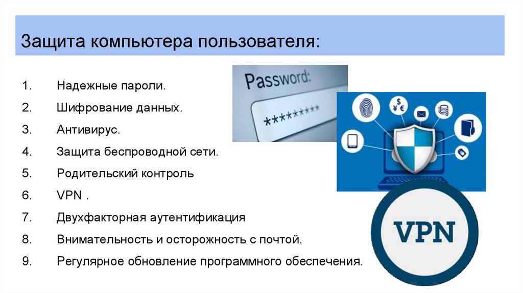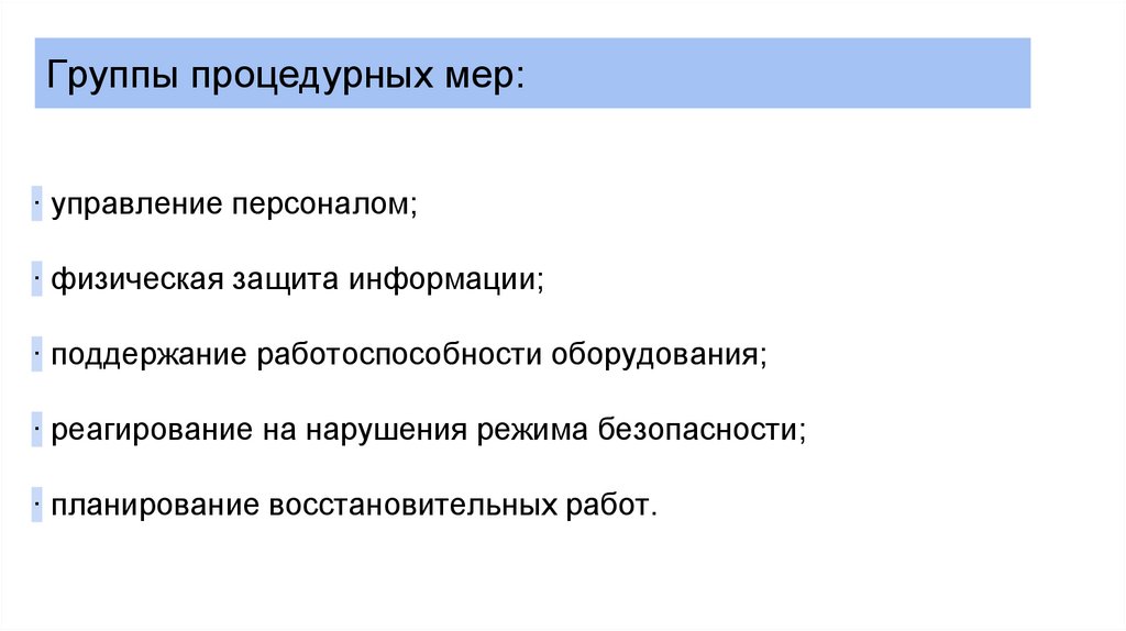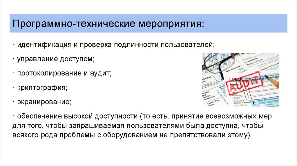 Программно-технические мероприятия:· идентификация и проверка подлинности пользователей;