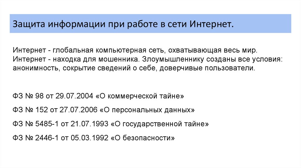 Защита информации при работе в сети Интернет.Интернет - глобальная компьютерная сеть, охватывающая весь мир.