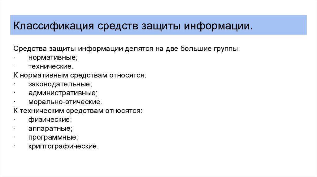 Классификация средств защиты информации.Средства защиты информации делятся на две большие группы: