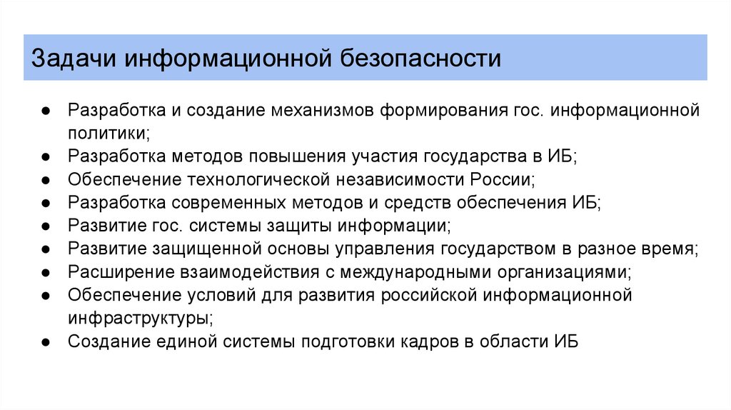 Задачи информационной безопасности● Разработка и создание механизмов формирования гос. информационной