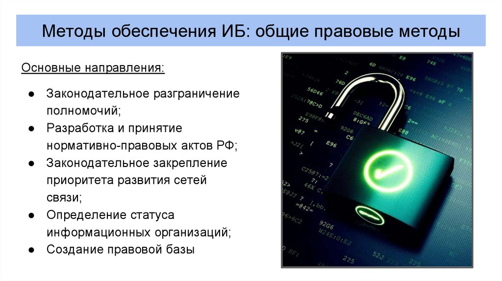 Методы обеспечения ИБ: общие правовые методыОсновные направления: